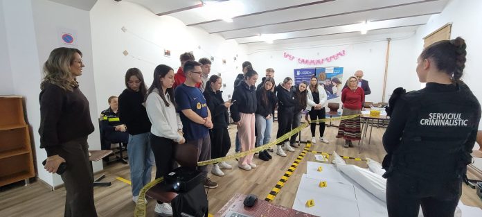 (Galerie foto)Lecție de criminalistică pentru elevii din Orăștie: polițiștii hunedoreni au pus în scenă o „cercetare la fața locului„
